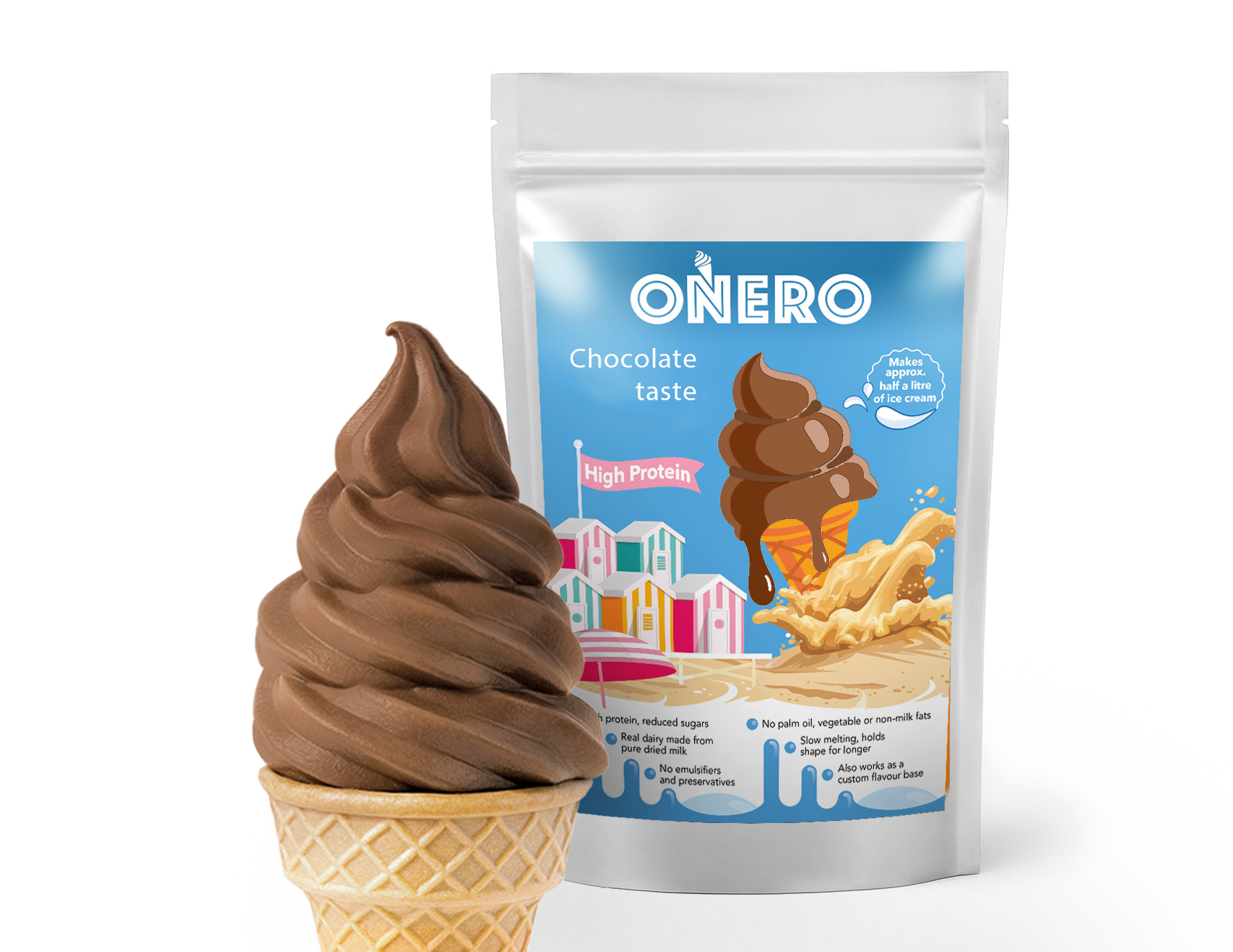 High-protein powder mix that turns into smooth soft-serve ice cream simply by mixing with water.