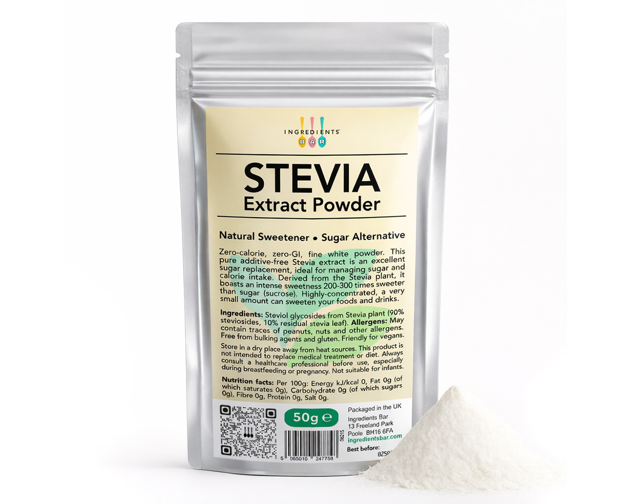 Fine white Stevia powder. A zero-calorie, zero-GI, natural sweetening agent and an excellent sugar alternative. Derived from the Stevia rebaudiana plant, it boasts an intense sweetness, 200-300 times sweeter than common sugar (sucrose). This high-quality extract contains a minimum of 90% Reb.A (Rebaudioside A), with the remaining 10% consisting of trace plant residues from the extraction process. Highly concentrated, a very small amount is sufficient to sweeten your foods and drinks without the calories of sugar. An ideal choice for those managing carbohydrate and calorie intake.